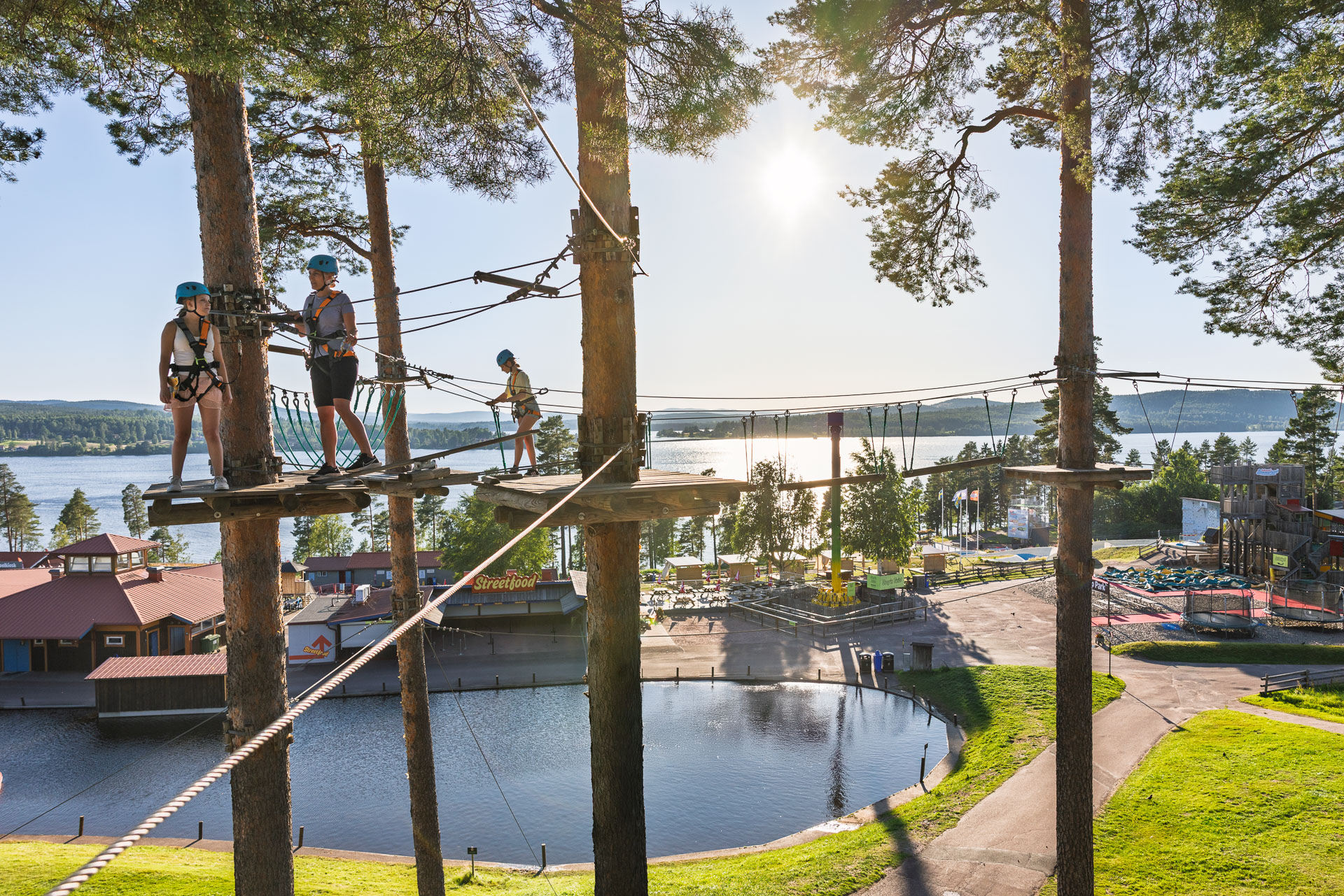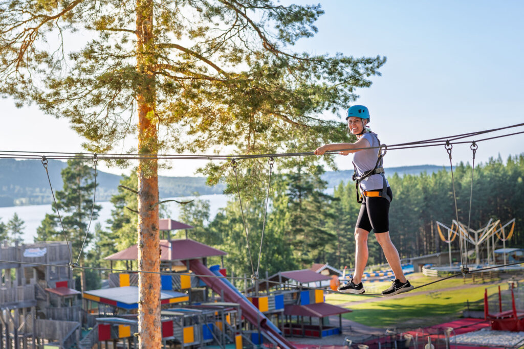 På Höghöjdsbanan på Leksand Sommarland väntar ett spännande äventyr 10 meter upp i luften, mitt bland de höga tallarna.